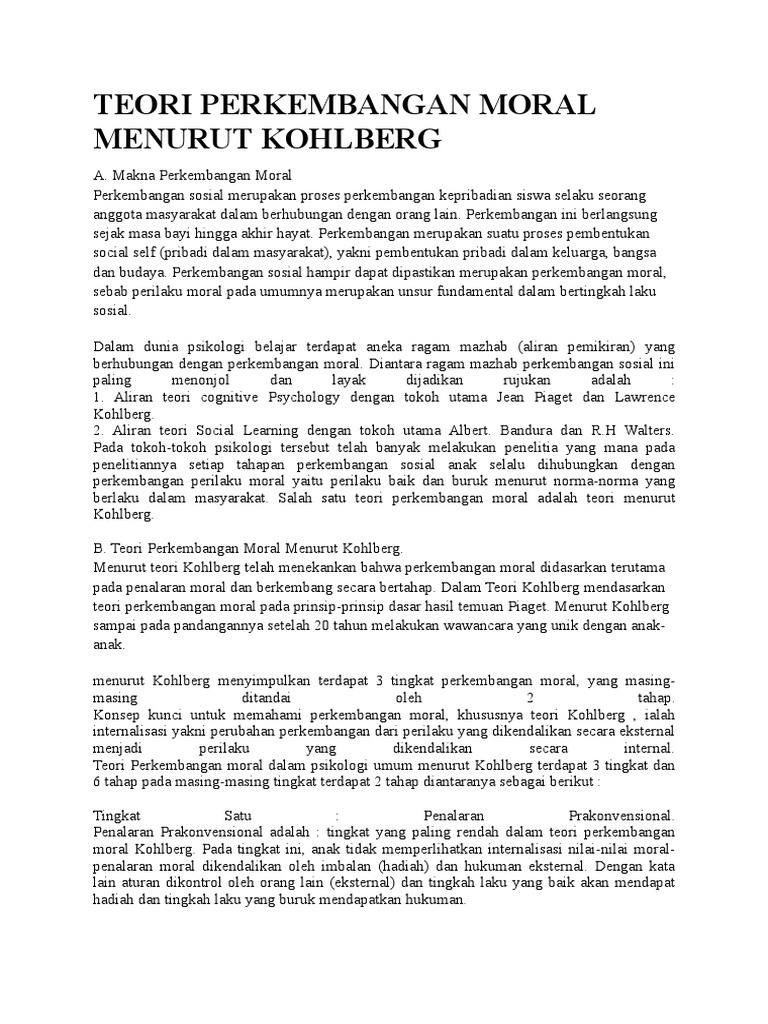 Teori Perkembangan Moral Menurut from imgv2-2-f.scribdassets.com Garrison, perkembangan adalah dihasilkan daripada tindakan yang saling berkaitan di antara perkembangan jasmani dan pembelajaran. Perkembangan ini berlangsung sejak masa bayi hingga akhir hayat. Adalah tahap perkembangan moral kedua , yang tercapai pada usia 10 tahun atau lebih. Tahapan perkembangan moral adalah ukuran dari tinggi rendahnya moral seseorang berdasarkan perkembangan penalaran moralnya seperti yang diungkapkan oleh lawrence kohlberg. (i) perspektif perkembangan moral kognitif teori perkembangan moral kognitif menyatakan bahawa perubahan dalam pertimbangan moral adalah berstruktur menerusi sistem berperingkat mengikut perkembangan dan kematangan intelek atau kognitif seseorang individu. Pada masa perkembangan moral konvensional, memenuhi harapan keluarga, kelompok, masyarakat, maupun bangsanya merupakan suatu perbuatan yang terpuji. Penurunan moral ini terjadi pada setiap individu dengan usia berapapun. Sementara d.s wright dan ann taylor